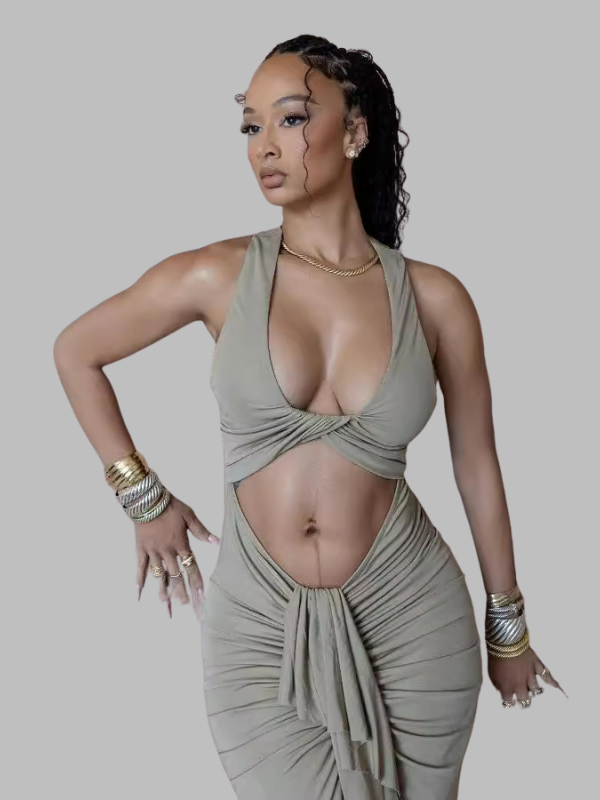Meet the Cut-Out Sage Maxi Dress, designed for women who command the spotlight. Featuring a plunging halter neckline, sultry midriff cut-outs, and flattering ruched details, this floor-length silhouette sculpts your curves with soft, stretchy fabric for total comfort and bold style.